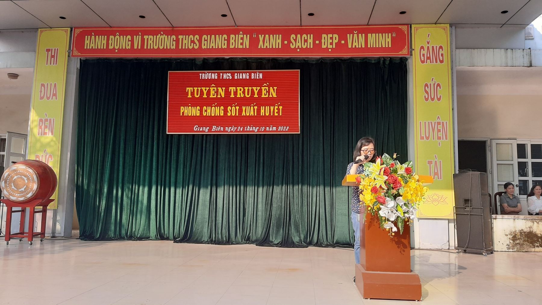 Thời tiết nắng nóng và mưa rào xen kẽ thất thường là điều kiện cho một số dịch bệnh phức tạp phát triển và lây lan, trong đó có bệnh sốt xuất huyết. Ngay tại thủ đô Hà Nội, dịch sốt xuất huyết đã bùng phát và lây lan, có rất nhiều ca mắc bệnh và đã có những trường hợp tử vong do bệnh sốt xuất huyết. Thấy rõ được sự nguy hiểm của dịch bệnh, ngay trong buổi chào cờ của tuần học mới- ngày 24 tháng 10 năm 2022, Trường THCS Giang Biên đã có buổi tuyên truyền “ Phòng chống sốt xuất huyết ”.